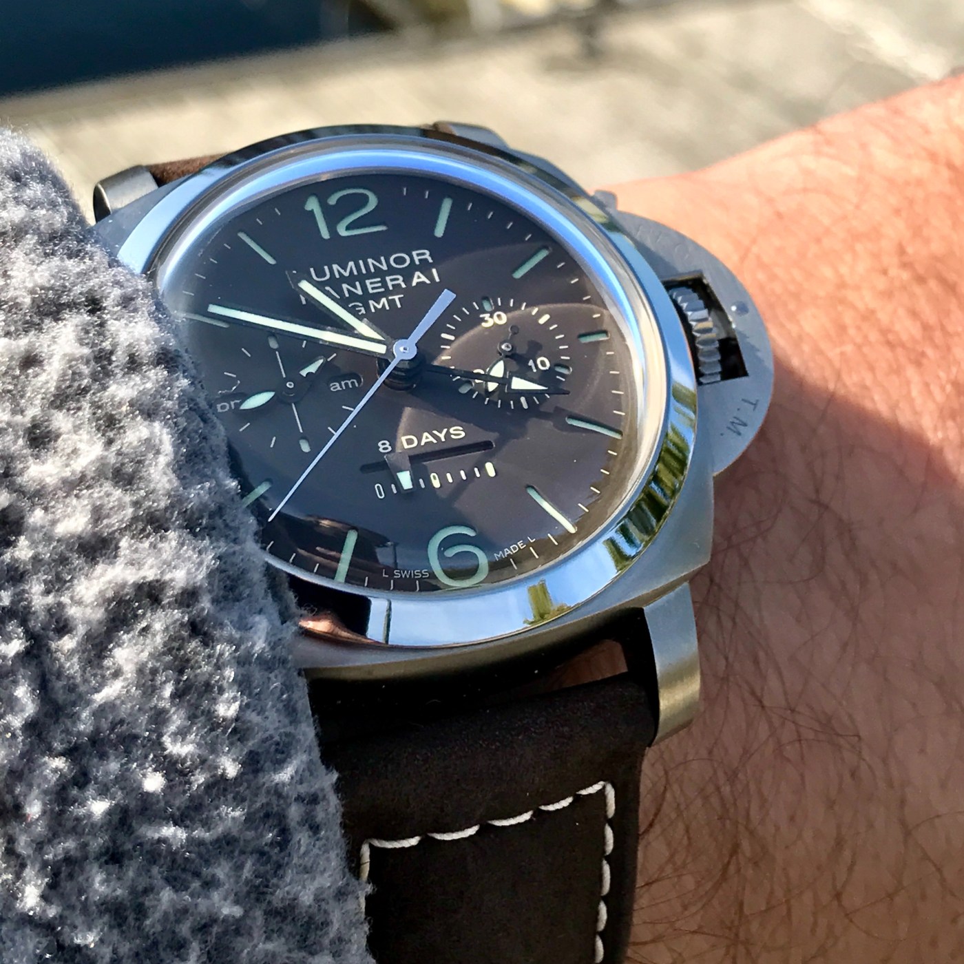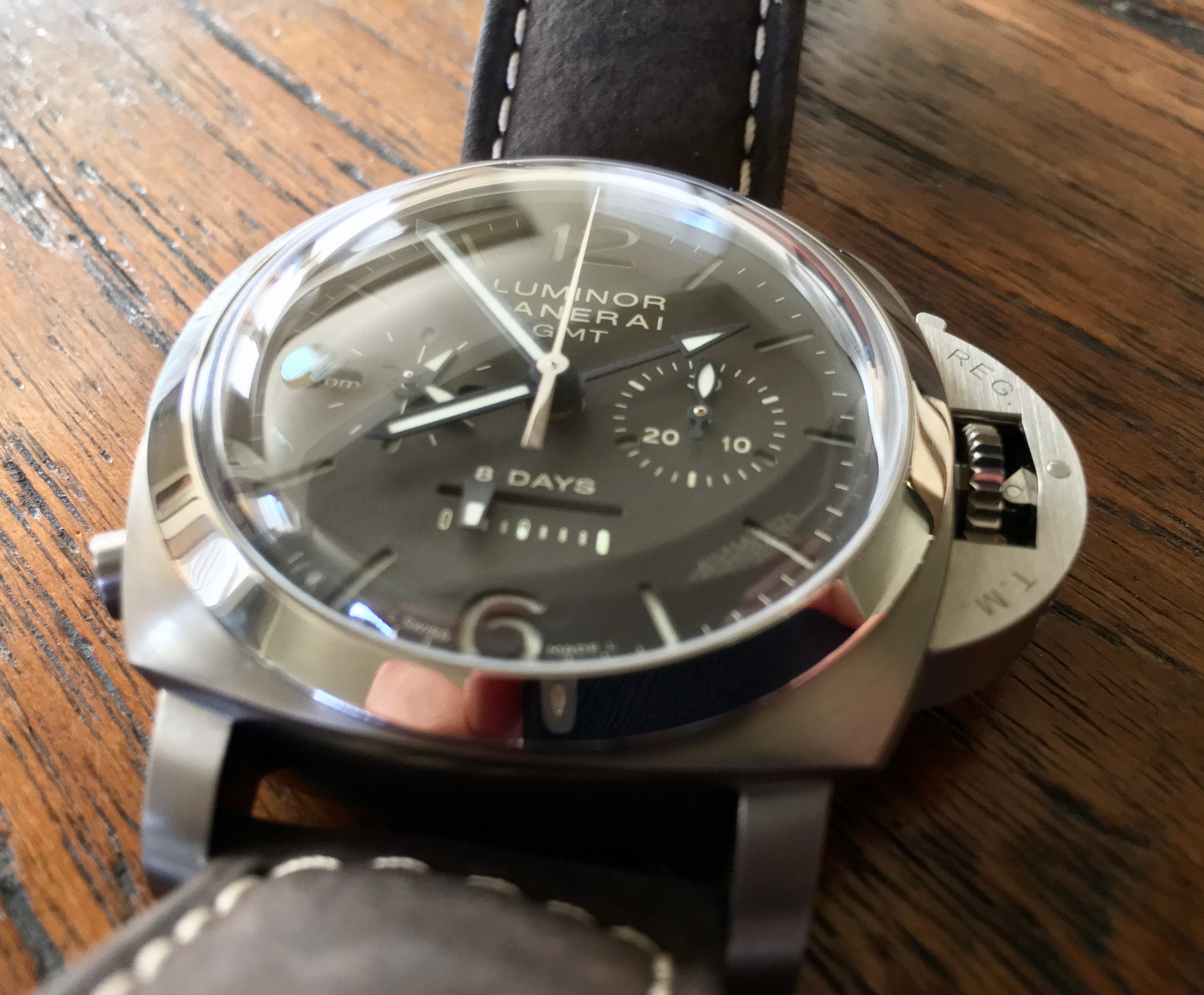 This is without a doubt one of my favorite Panerai watches (either in general or in my collection). It has the bubble crystal like on my trusty PAM 233. It has a sandwich dial. It has a titanium case (which also means it gets Panerai’s brown tobacco dial treatment). It has a display back. It has a 12-hour GMT hand as well as a 24-hour dial that shares space with the second hand dial. It has an 8-day power reserve with the remaining power “shark tooth” complication on the bottom of the dial. And it’s a chrono.